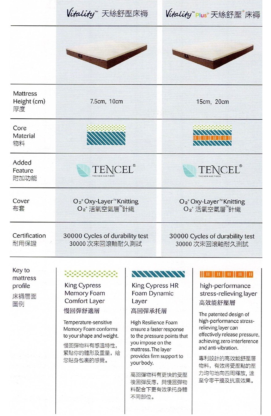 Vitality+天絲舒壓床褥多層結構, 承托層採用高回彈物料,給您最佳的承托, 舒適層採用慢回彈物料,讓您享受零壓力輕柔體驗, 加上舒爽透氣的天絲針織布套,讓您盡享舒適健康睡眠 香港執業脊醫協會認可產品 呎吋: 60"x75",54"x75",48"x75",42"x75",36"x75",30"x75" 60"x72",54"x72",48"x72",42"x72",36"x72",30"x72"