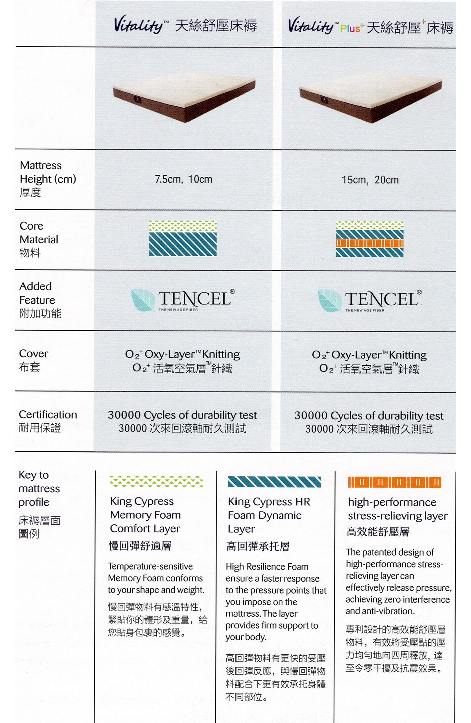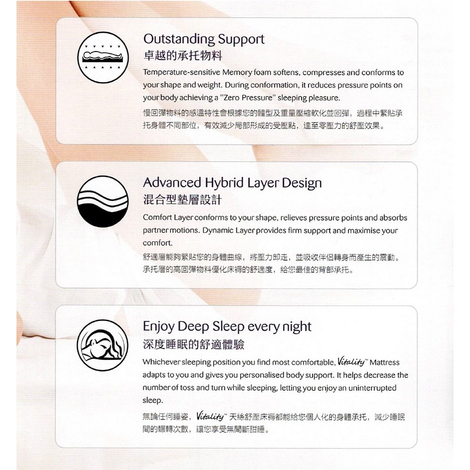 Vitality+天絲舒壓床褥多層結構, 承托層採用高回彈物料,給您最佳的承托, 舒適層採用慢回彈物料,讓您享受零壓力輕柔體驗, 加上舒爽透氣的天絲針織布套,讓您盡享舒適健康睡眠 香港執業脊醫協會認可產品 呎吋: 60"x75",54"x75",48"x75",42"x75",36"x75",30"x75" 60"x72",54"x72",48"x72",42"x72",36"x72",30"x72"