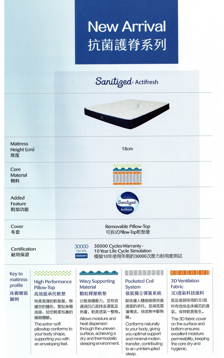 瑞士公司SANITIZED AG是世界級的抗菌衛生產品生產商。 經過Sanitized技術處理的紡織品,有效抑制細菌繁殖, 同時具備抗敏,消除異味,抑制霉菌生長,減少病原體第多項防護功能。 高效能承托軟墊,特柔高彈的軟墊層,根據您的體形,緊貼身體曲線,給您輕柔包裹的睡眠體驗。 顆粒釋壓軟墊分散身體壓力,並有效通過凹凸面排走濕氣及熱量,乾爽透氣一整晚。 袋裝獨立彈簧系統能依據人體曲線提供最適當的承托,並減低震盪傳送,締造無中斷熟睡。 3D透氣科技面料,面及底部採用的3D面料有效排走床褥芯的濕氣,保持乾爽衛生。 呎吋: 60"x75",54"x75",42"x75",48"x75",36"x75",30"x75", 60"x72",54"x72"48"x72",42"x72",36"x72",30"x72"