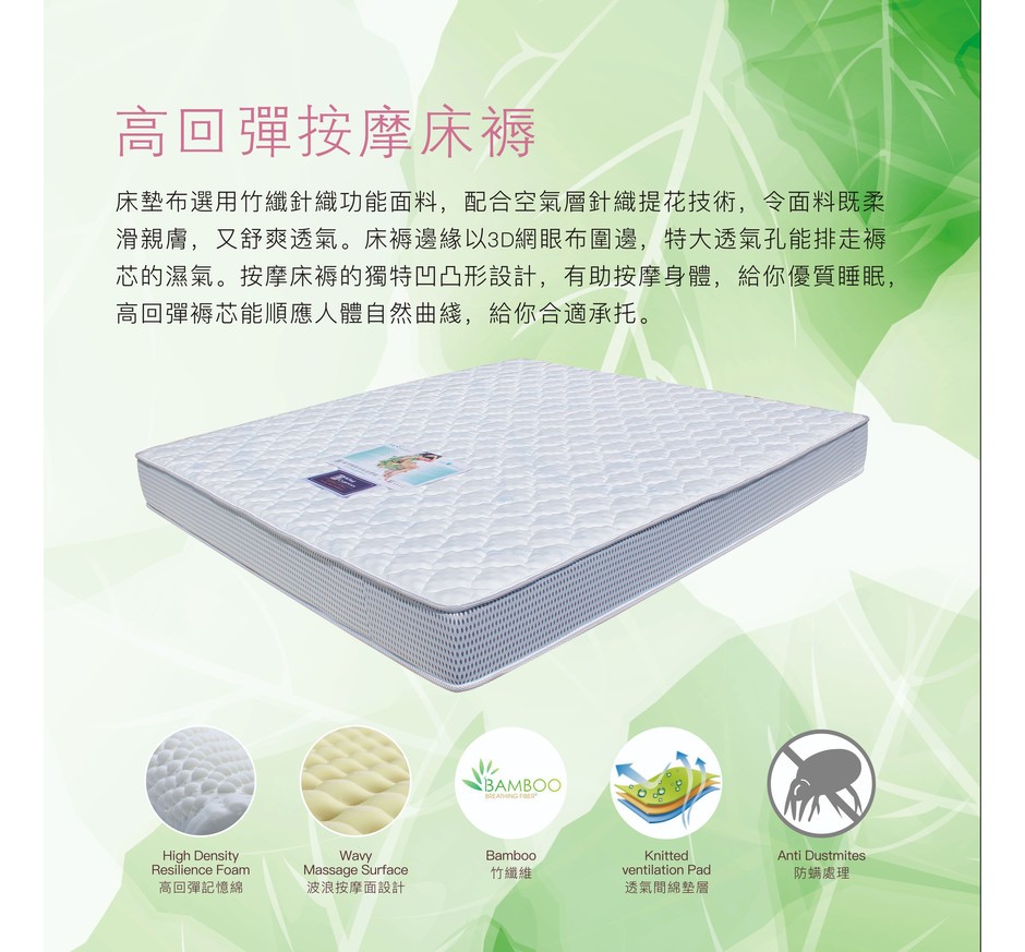 床墊布選用竹纖®針織功能面料,配合空氣層針織提花技術, 令面料既柔滑親膚,又舒爽透氣, 床褥邊緣以3D網眼布圍邊,特大透氣孔能排走褥芯的濕氣, 高回彈褥芯能順應人體自然曲線,給你合適承托, 產品通過國際標準組織:標準耐久度測試BS EN1957:2012、ISO14184-1甲醛含量測試、ISO16000-6:2011 VOC排放測試及USEPA30560B可溶性金屬含量,證明產品無甲醛、VOC釋放,及不含任重金屬