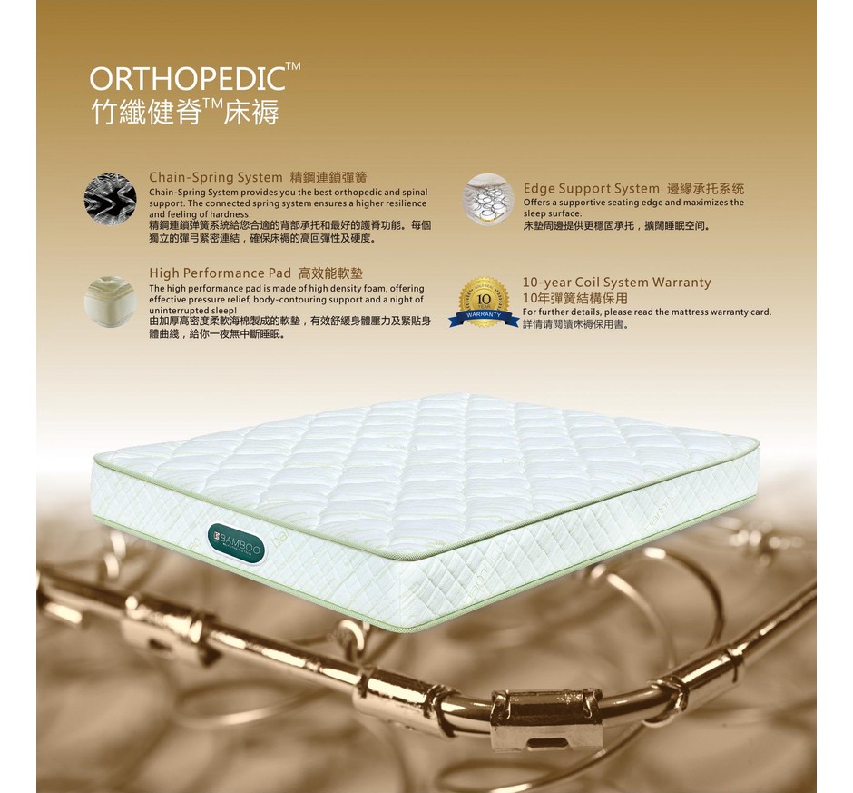 床墊布選用竹纖®針織功能面料,配合空氣層針織提花技術, 令面料既柔滑親膚,又舒爽透氣, 精鋼連鎖彈簧系統給你合適的背部承托和最好的護脊功能, 每個獨立的彈簧緊密連接,確保床褥的高回彈性及硬度, 邊緣承托系統為床褥周邊提供更穩固的承托,擴闊睡眠空間, 由加厚高密度柔軟海棉製成軟墊, 有效紓緩身體壓力及緊貼身體曲線, 產品通過國際標準組織: 標準耐久度測試BS EN1957:2012、 ISO14184-1甲醛含量測試、 ISO16000-6:2011 VOC排放測試及 USEPA30560B可溶性金屬含量, 證明產品無甲醛、VOC釋放,及不含任重金屬 10年彈簧結構保用,詳情請參閱床褥保用書